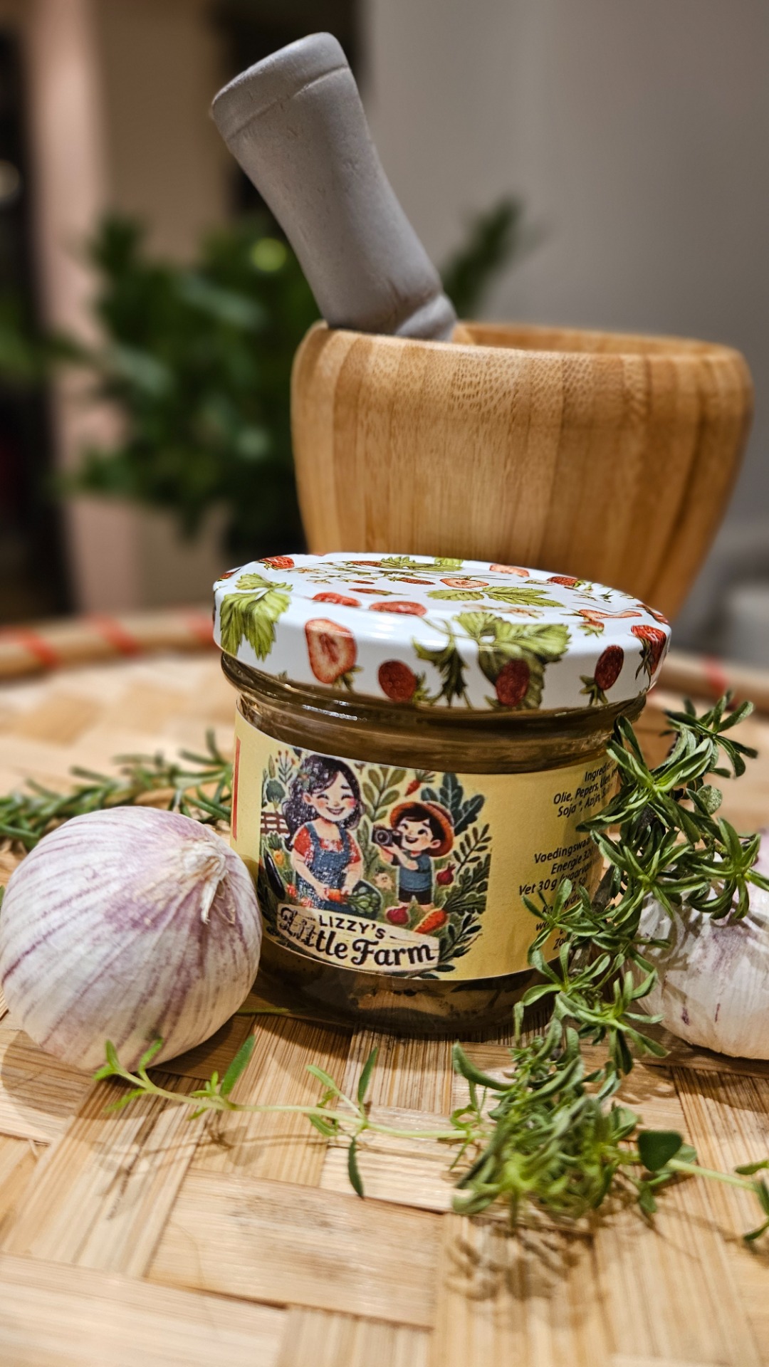 Recht uit onze tuin — vol liefde en smaak. De knoflooktenen worden langzaam samen met olijfolie en geurige kruiden uit onze eigen tuin geconfijt, tot ze boterzacht zijn. Heerlijk om direct op warm brood of toast te smeren, of om je gerechten een volle, zachte knoflooksmaak te geven. Verpakt in een ambachtelijk potje van 125 ml — pure smaak, rechtstreeks van Lizzy's Farm.